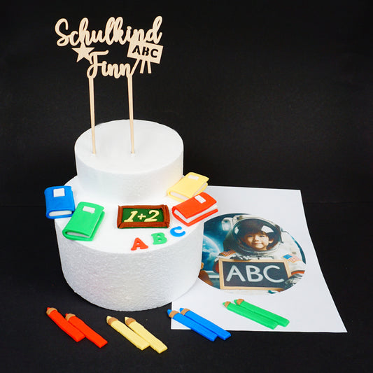 Einschulungsdeko Set 5 / Dekoset mit Aufleger und personalisiertem Caketopper