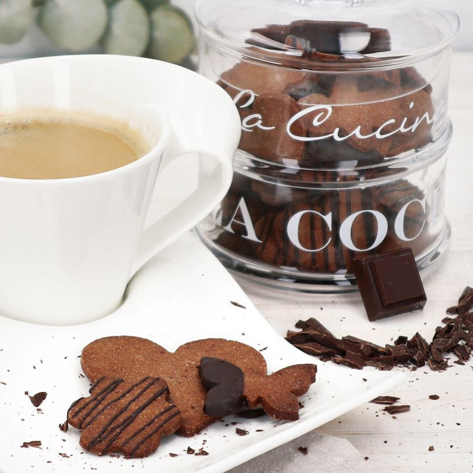 Für die Kekse die Backmischung, das Kakaopulver, die Butter und das Ei in eine Schüssel geben und mit einem elektrischen Handrührgerät oder in der Küchenmaschine zu einem glatten Teig verarbeiten. Den Teig in Frischhaltefolie einwickeln und mind. 2 Stunden im Kühlschrank ruhen lassen. Nach der Kühlphase den Teig noch einmal kurz durchkneten, auf einer mit Mehl bestäubten Arbeitsfläche dünn ausrollen und die gewünschten Motive ausstechen. Die Kekse auf einem mit Backpapier ausgelegten Backblech verteilen und im Backofen bei 200°C Ober-/Unterhitze ca. 8-10 Min. goldbraun backen. Die Kekse anschließend auskühlen lassen.