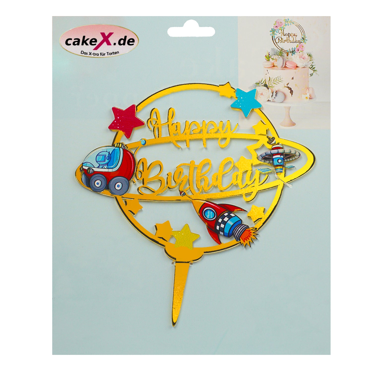 Dieser goldene Kuchenstecker aus Acryl ist ein echter Hingucker für alle Weltraum-Fans! Mit seinem „Happy Birthday“-Schriftzug und den kleinen Planeten-Motiven passt er perfekt auf Geburtstagskuchen und Torten.