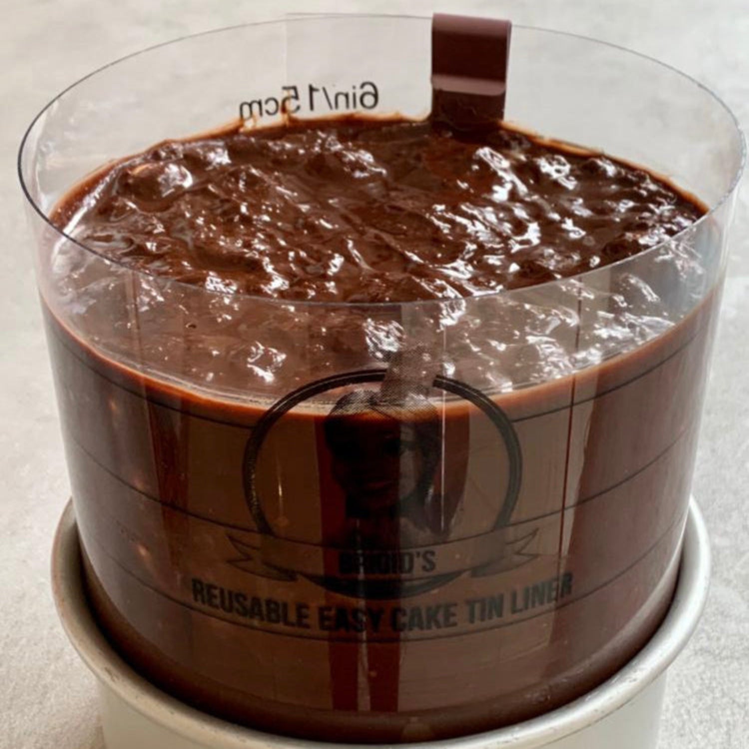 Der Liner wird einfach um den Kuchen gelegt, anschließend mit Ganache (nach spezieller Rezeptur) gefüllt und im Kühlschrank ausgehärtet. So erhältst du eine superglatte, saubere Oberfläche mit scharfen Kanten – ganz ohne Kleckern oder großen Aufwand.